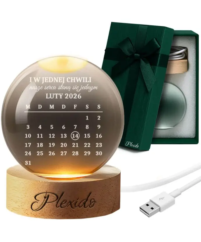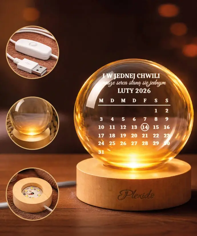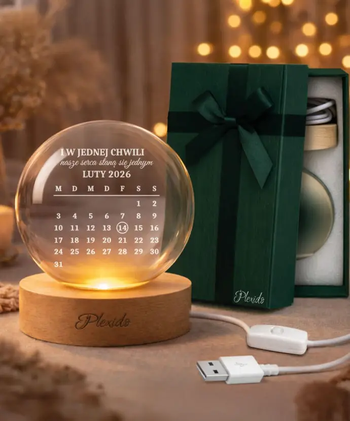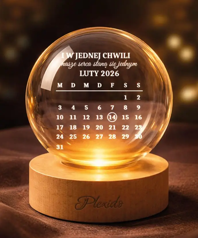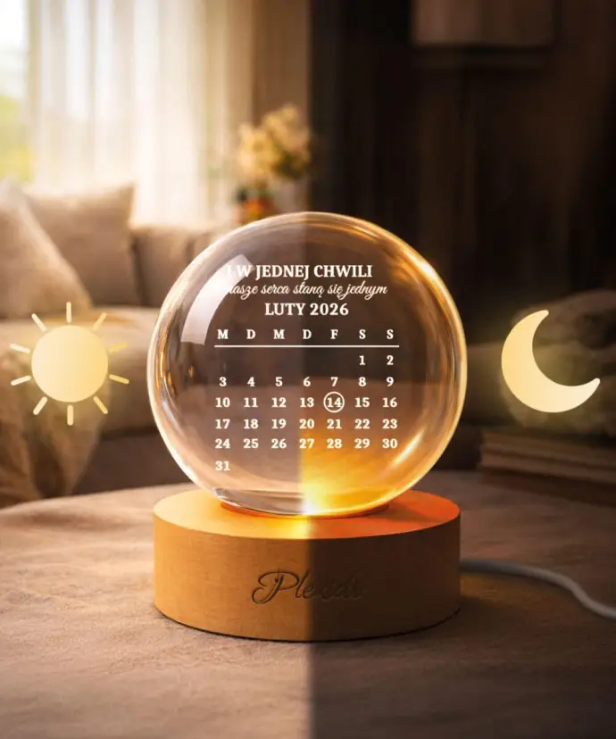 Wewnątrz kuli znajduje się symboliczny motyw podkreślający miłość i bliskość, który w połączeniu z ciepłym podświetleniem LED tworzy nastrojową, romantyczną atmosferę. Światło subtelnie wydobywa detale graweru, nadając całości elegancki wygląd.