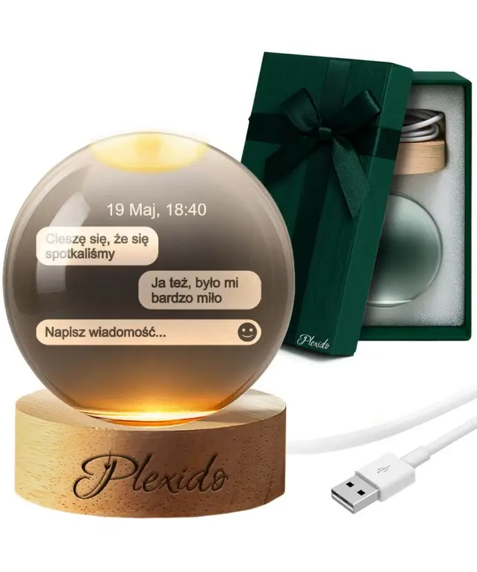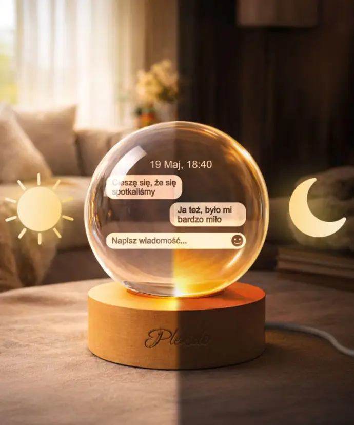 Solidna, drewniana podstawka dopełnia całość naturalnym, premium akcentem. Szklana kula doskonale prezentuje się na komodzie, półce lub stoliku nocnym i stanowi trwałą, wzruszającą pamiątkę gotową do wręczenia jako prezent.