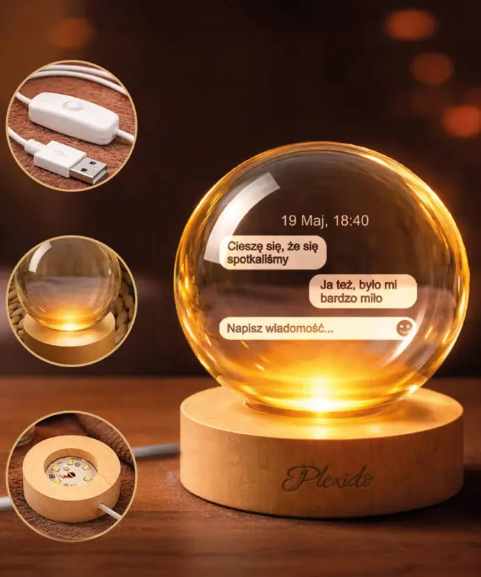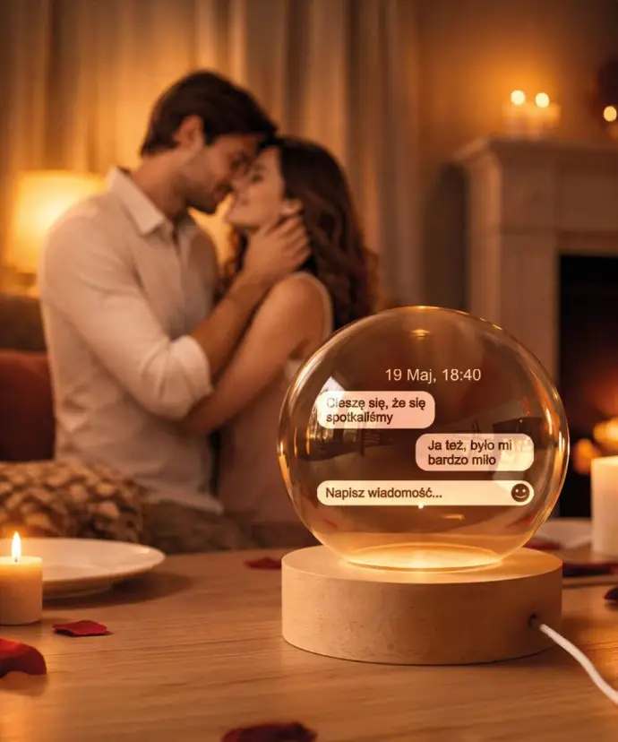 Wewnątrz kuli znajduje się symboliczny motyw podkreślający miłość i bliskość, który w połączeniu z ciepłym podświetleniem LED tworzy nastrojową, romantyczną atmosferę. Światło subtelnie wydobywa detale graweru, nadając całości elegancki wygląd.