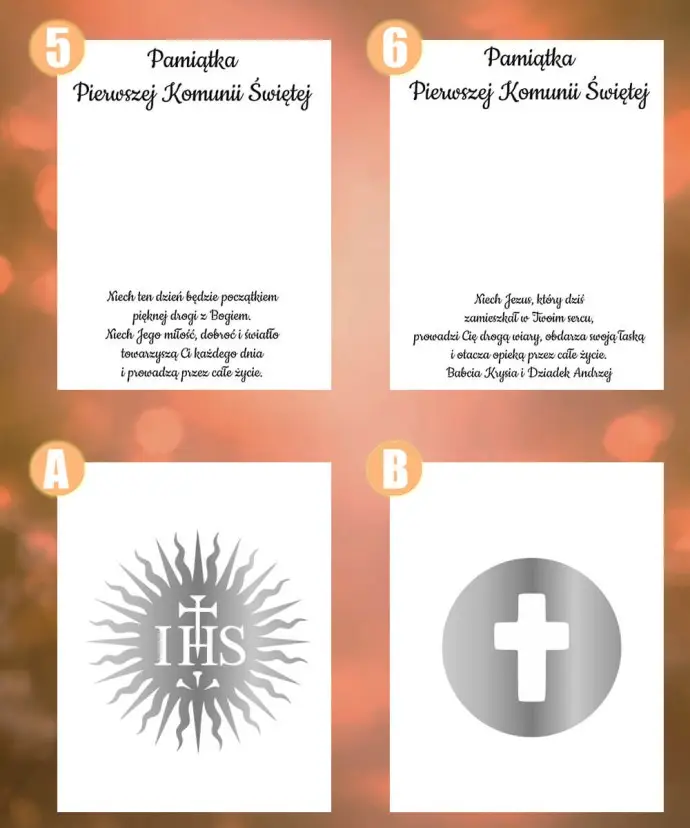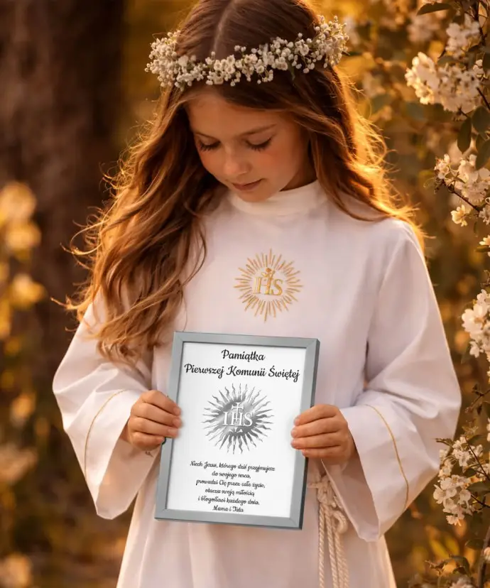 Centralnym elementem projektu jest symbol IHS, który podkreśla duchowy wymiar uroczystości i nadaje całości wyjątkowej głębi. Subtelna kompozycja oraz klasyczna kolorystyka sprawiają, że ramka doskonale wpisuje się w charakter Pierwszej Komunii Świętej.