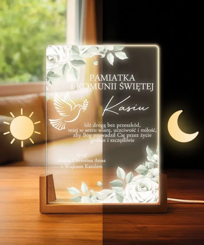 Personalizowana lampka LED na Komunię z imieniem i dedykacją to elegancka pamiątka, która zachwyca efektem podświetlenia i wyjątkowym designem. Idealny prezent na Pierwszą Komunię Świętą, który zostaje na lata.
