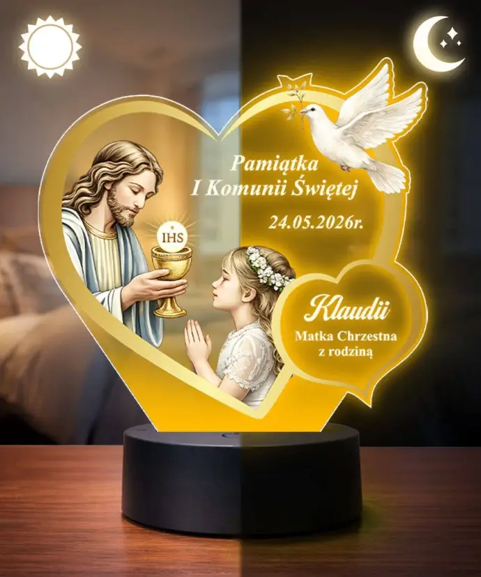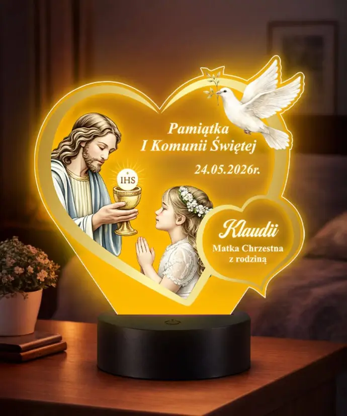Lampka komunijna z personalizacją marki Plexido to wyjątkowy pomysł na prezent z okazji Pierwszej Komunii Świętej. To elegancka i symboliczna pamiątka, która zostaje z dzieckiem na długie lata.