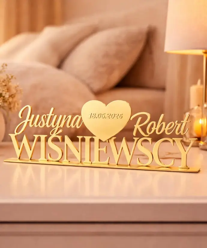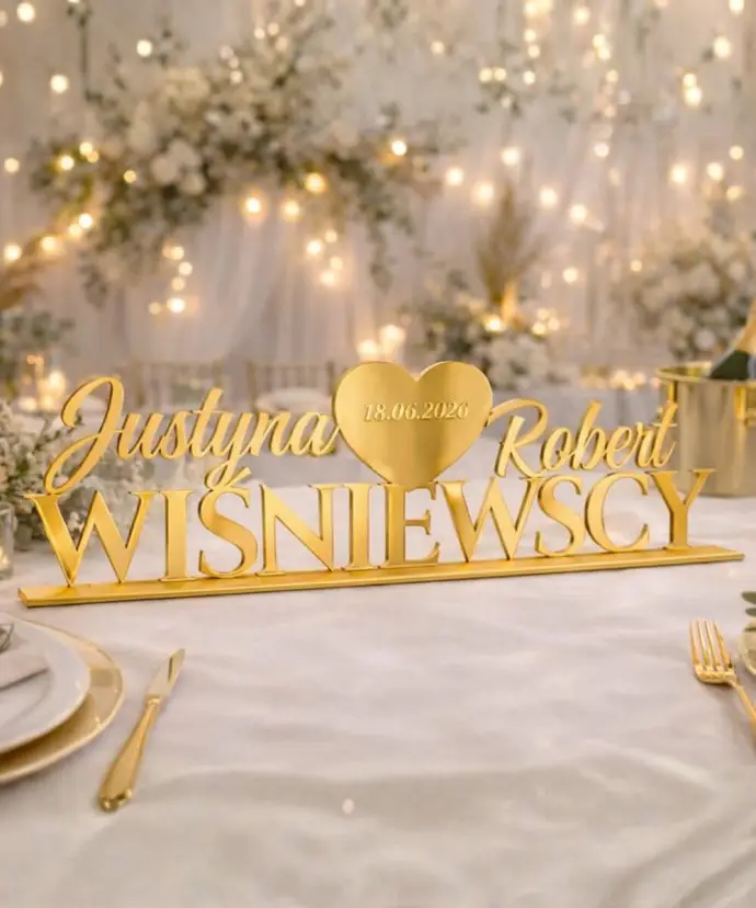 Możliwość dodania imion Pary Młodej, nazwiska oraz daty ślubu sprawia, że dekoracja staje się w pełni indywidualna i dopasowana do Waszego wydarzenia. To nie tylko ozdoba stołu, ale również wyjątkowa pamiątka, którą można zachować na lata.