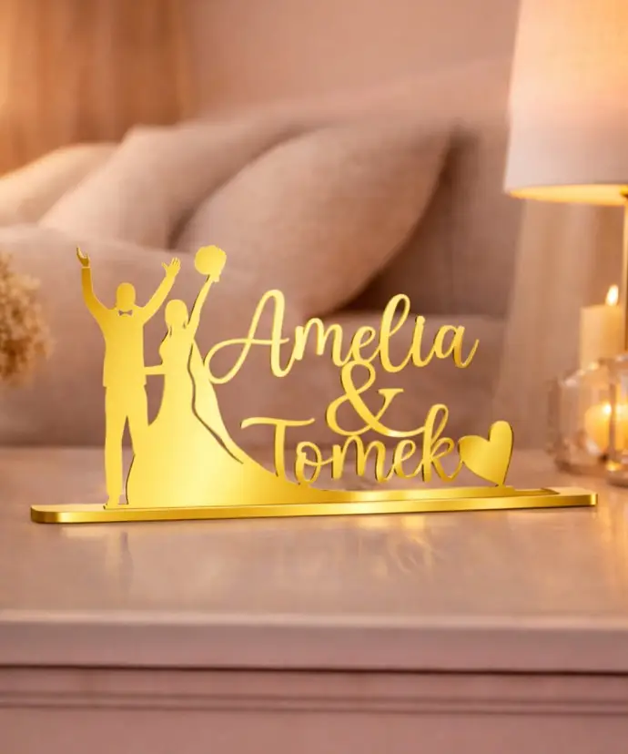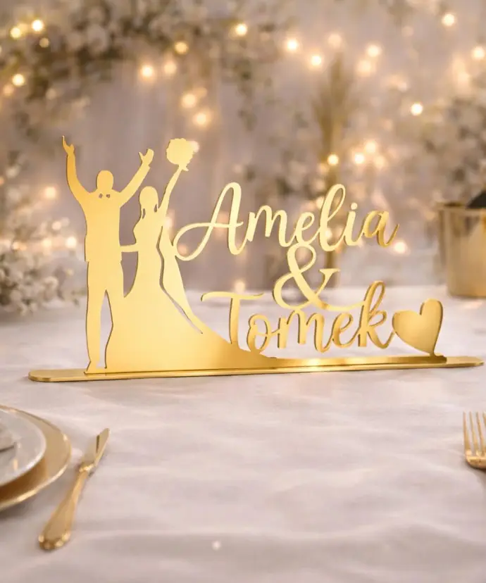 Wykonany z lustrzanej plexi w złotym wykończeniu, pięknie odbija światło i otoczenie, nadając aranżacji luksusowego wyglądu. Same Imiona Pary Młodej prezentują się wyjątkowo elegancko i minimalistycznie, dzięki czemu idealnie wpisuje się w nowoczesne i klasyczne dekoracje.